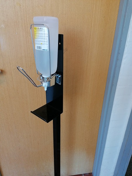 Vi har samlet et sæt med stander, dispenser samt 1 liter hånddesinfektion, færdigmonteret.